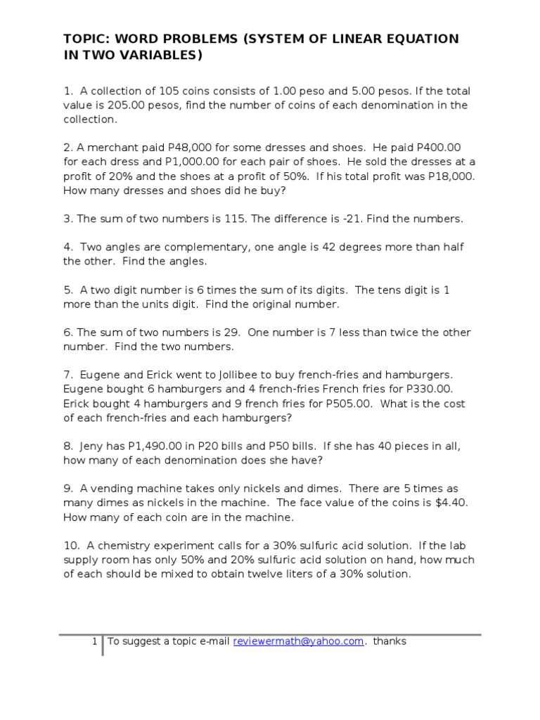 System Of Linear Equations Word Problems Worksheet