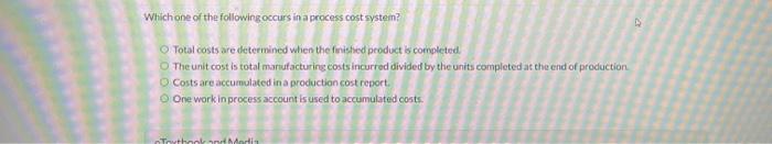 A high volumes of output b low unit costs c high amount of specialized equipment d skilled workers 37. Total costs are determined when the finished product is completed. All of these. One Work in Process account is maintained for all the processes similar to a job order cost system. FI - Financial Accounting. When the products are sold. Which of the following manufacturing cost elements occurs in a process cost system. In process cost systems costs are accumulated but not assigned. A Work in Process account is maintained for each product.